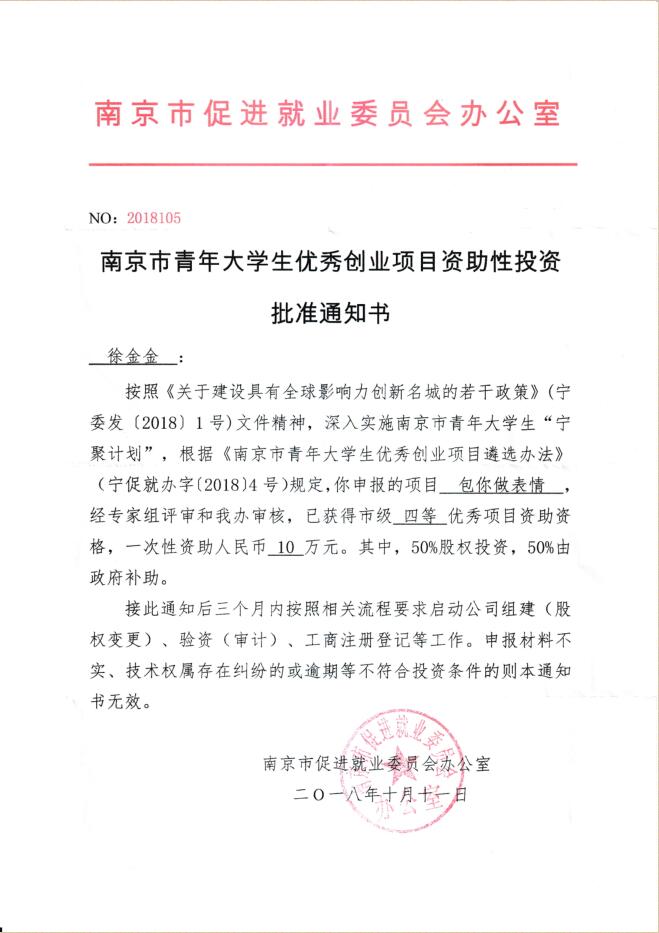 2018年10月11日,在南京市大学生优秀创业项目评比中,必赢线路检测3003no1学子徐金金、韦苗苗“依智科技”团队申报的“包你做表情”项目,被评为南京市大学生优秀创业项目,获得市级四等资助资格,一次性资助10万元。同时,该项目在中国高校计算机大赛(微信小程序应用开发赛)中获得华东赛区三等奖。