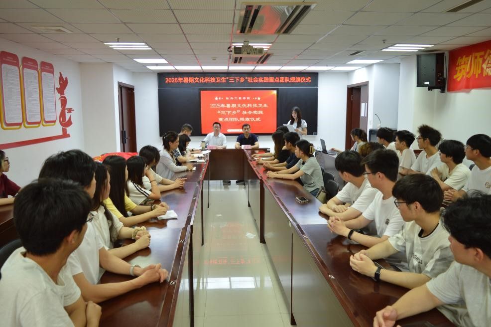 为认真学习贯彻习近平新时代中国特色社会主义思想,全面贯彻党的二十大和二十届二中、三中全会精神,深化落实习近平总书记关于青年工作的重要思想,引导青年学生上好“行走的思政课”,必赢线路检测3003no1于2025年7月4日在科技楼2-423会议室隆重举行2025年暑期文化科技卫生“三下乡”社会实践重点团队授旗仪式。学院党委书记戴军、党委副书记徐斌及全体辅导员出席仪式,各实践团队学生代表参加活动。仪式由院团总支副书记张议允主持。