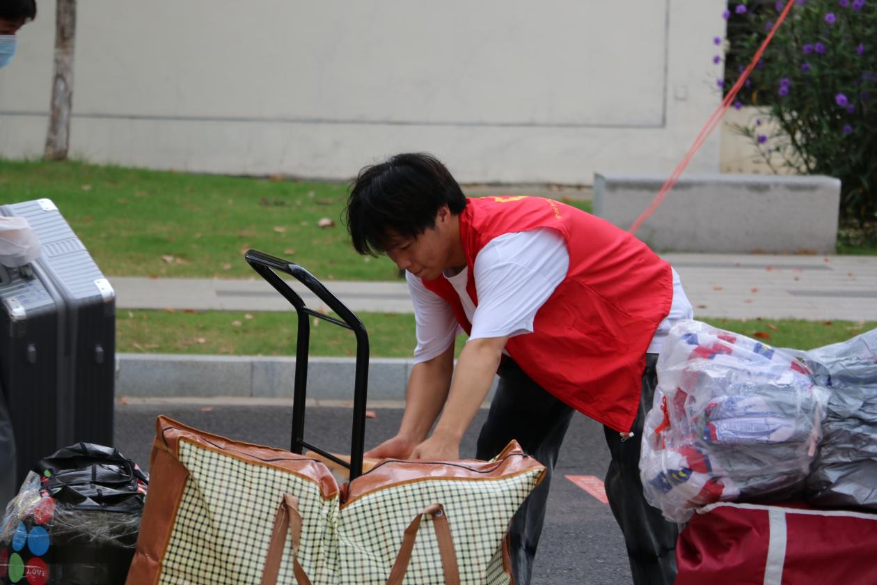 结合部分新生物品较多实际,学院报到现场坚持“快、准”的原则,现场所有流程包括身份证查验、新生报到查验扫码、竞赛答题和拍照,全部在“一分钟”内完成。同时,学院专门组织了“志愿红”帮助新同学搬运行李。