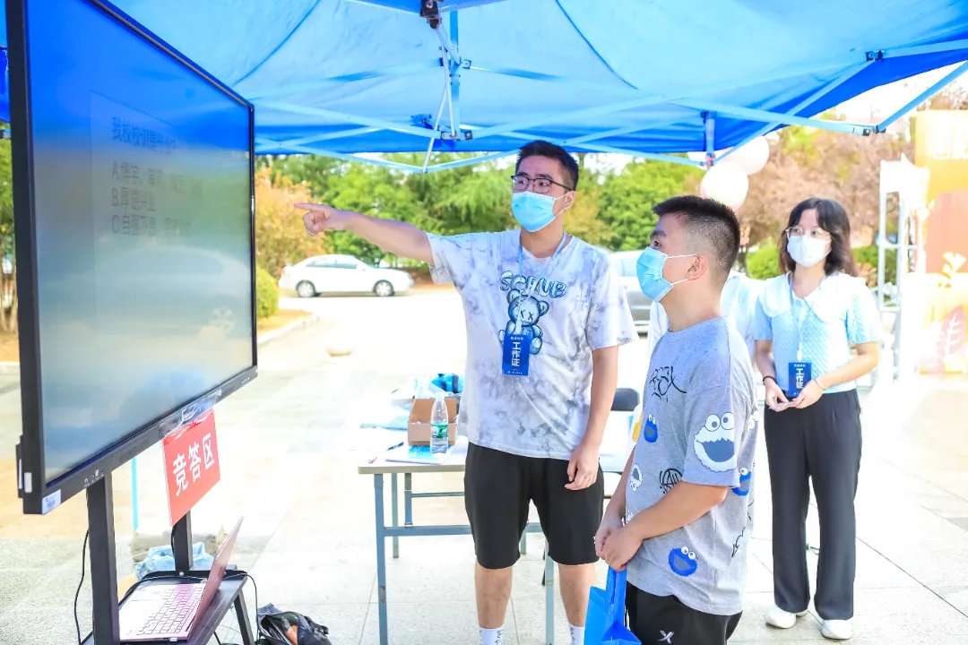 学院将迎新活动与宣传校园文化有机结合,通过知识竞答的方式增强同学们对校风校训、校园安全、网络诈骗和专业知识的认知。并通过拍照或视频采访的形式记录报到新生的入学美好瞬间,征集新生对四年后的自己想说的话。