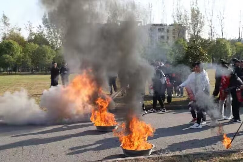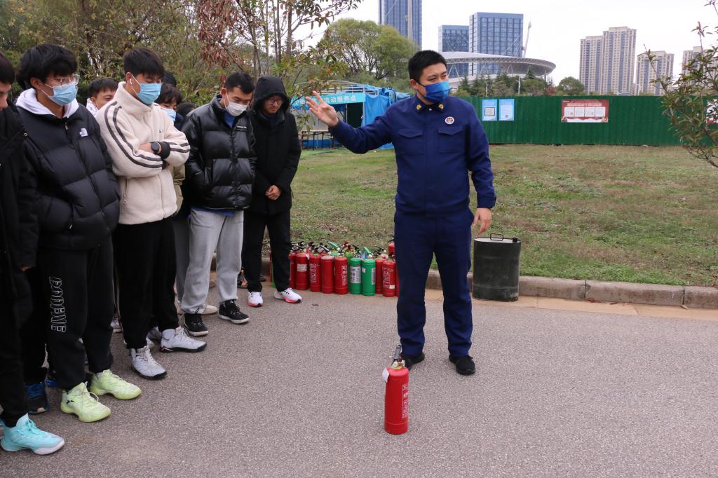 讲座后,严丹老师和张理航老师带领同学们来到室外进行灭火器使用操作演习。严丹老师还通过生动有趣的实践给同学们讲解了灭火器的使用,强调了灭火器的使用“提、拔、瞄、压”四步要领后,以及灭火时必须站在距离起火点5米左右,且要处于上风口,同学们在两位老师的指导下进行了灭火器的实际操作,成功将火扑灭。