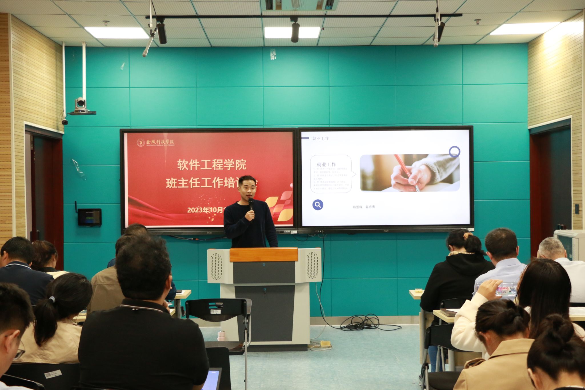 培训内容主要围绕班主任的岗位职责和工作任务展开。张理航老师对学院班主任工作职责和安全管理工作实施方案的相关要求进行了详细解读,他通过已发生的实际案例展示,就班主任如何快速、准确、稳妥的应对方面进行了有益的指导。李勇老师通报了近年来的就业情况及当前的就业形势,提出推进就业工作应该在早准备、育情感和造氛围上下工夫,他在就业理念教育、就业服务指导和搭建就业桥梁等多种措施上进行了重点讲解。杜文娟老师在班级日常管理、学风建设、评奖评优、资助工作、心理工作和班主任工作系统使用方面进行了梳理和培训。邵彦婷老师着重讲述了发展党员的时间节点和发展流程。