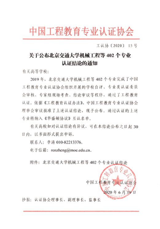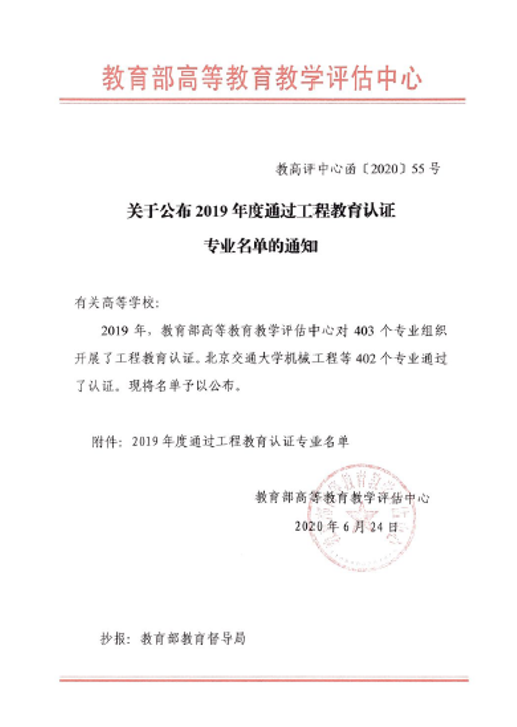 近日,教育部高等教育教学评估中心、中国工程教育专业认证协会正式发布《关于公布2019年度通过工程教育认证专业名单的通知》(教高平中心函[2020]55号)和《关于公布北京交通大学机械工程等402个专业认证结论的通知》(工认协[2020]15号),公布了2019年度通过工程教育认证专业名单。必赢官网软件工程专业顺利通过工程教育专业认证,成为该专业通过认证的首批应用型高校。