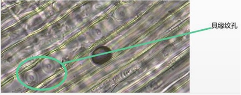 清晰可见的松枝具缘纹孔(10×40倍)
