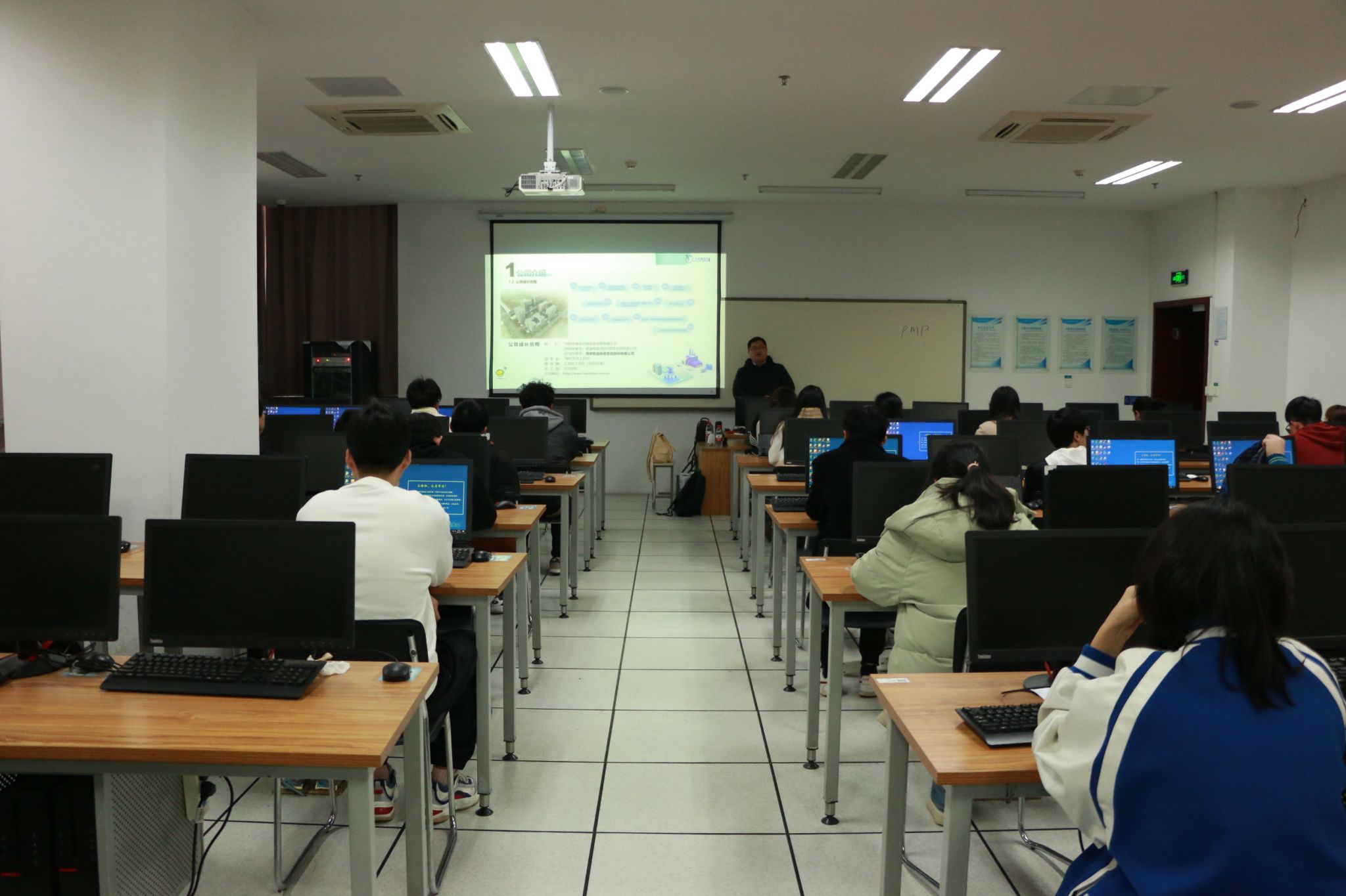 宣讲会上,联迪信息系统股份有限公司周经理详细介绍了企业概要、事业内容、企业文化、资质荣誉等情况,他以在联迪信息的众多我院校友成功案例分析了在联迪信息就业的优势,并就职业规划、培训体系和薪酬福利等问题做了详细说明。最后,他提出今年招聘50名人才的迫切需求,期望同学们加盟。