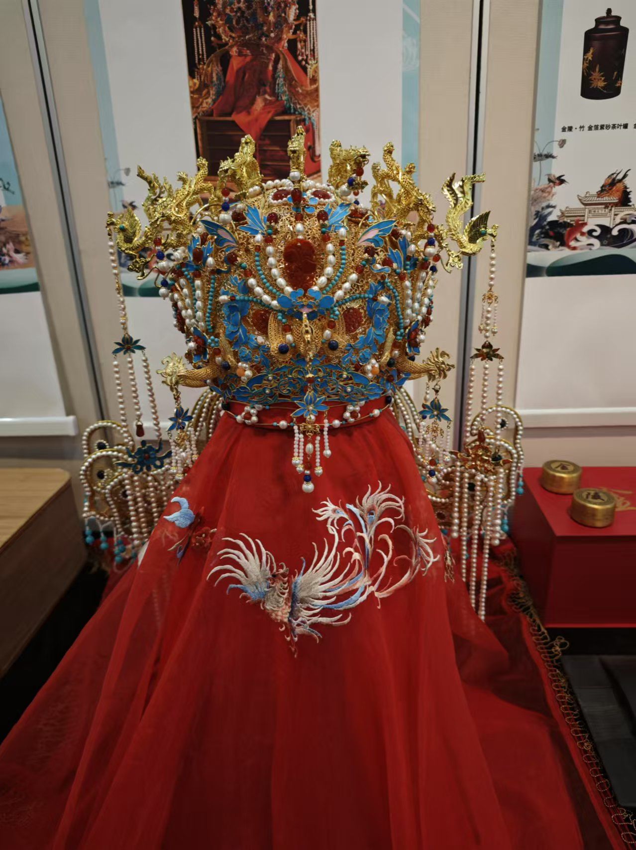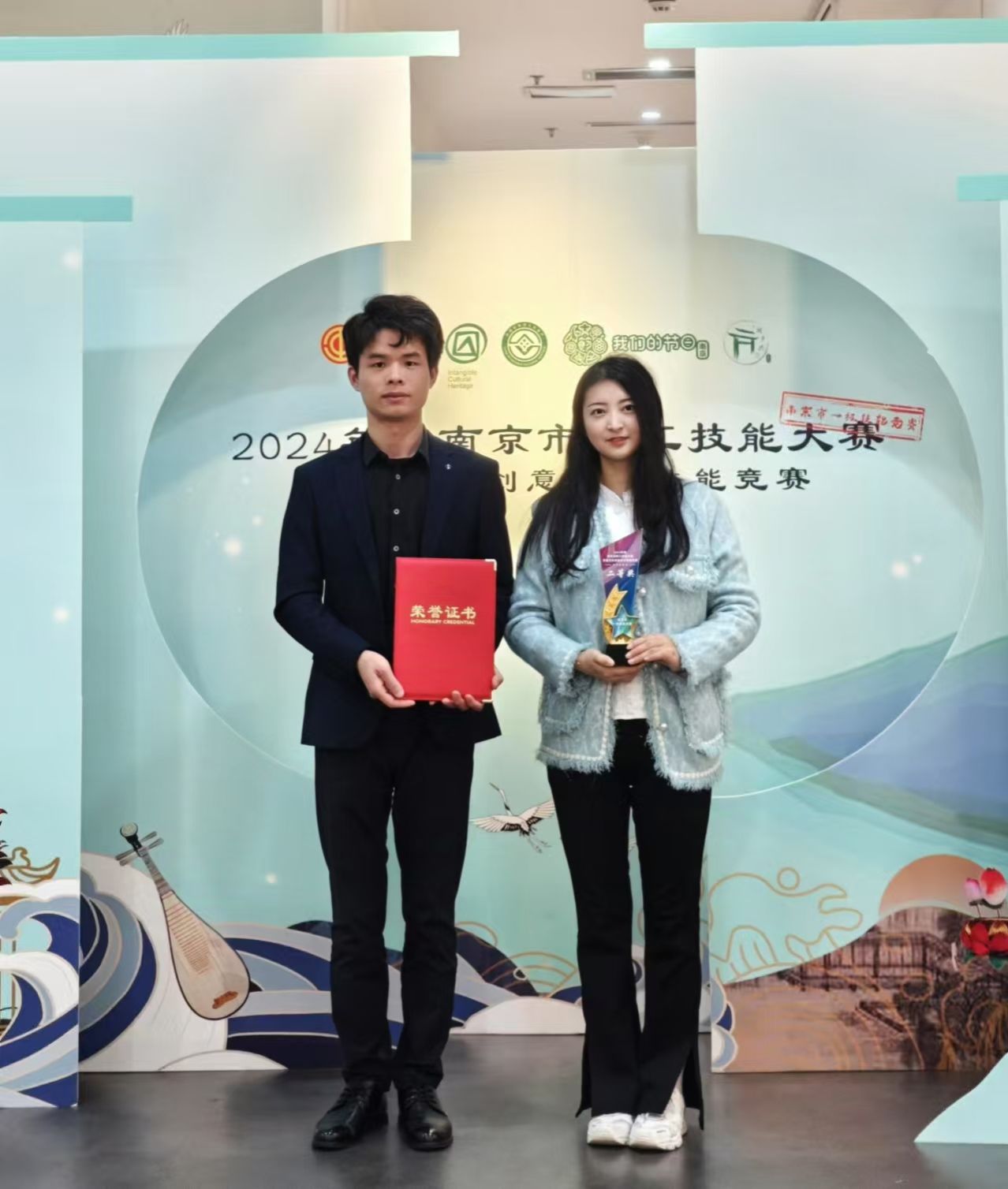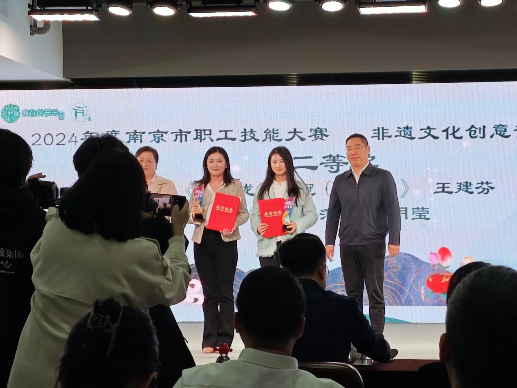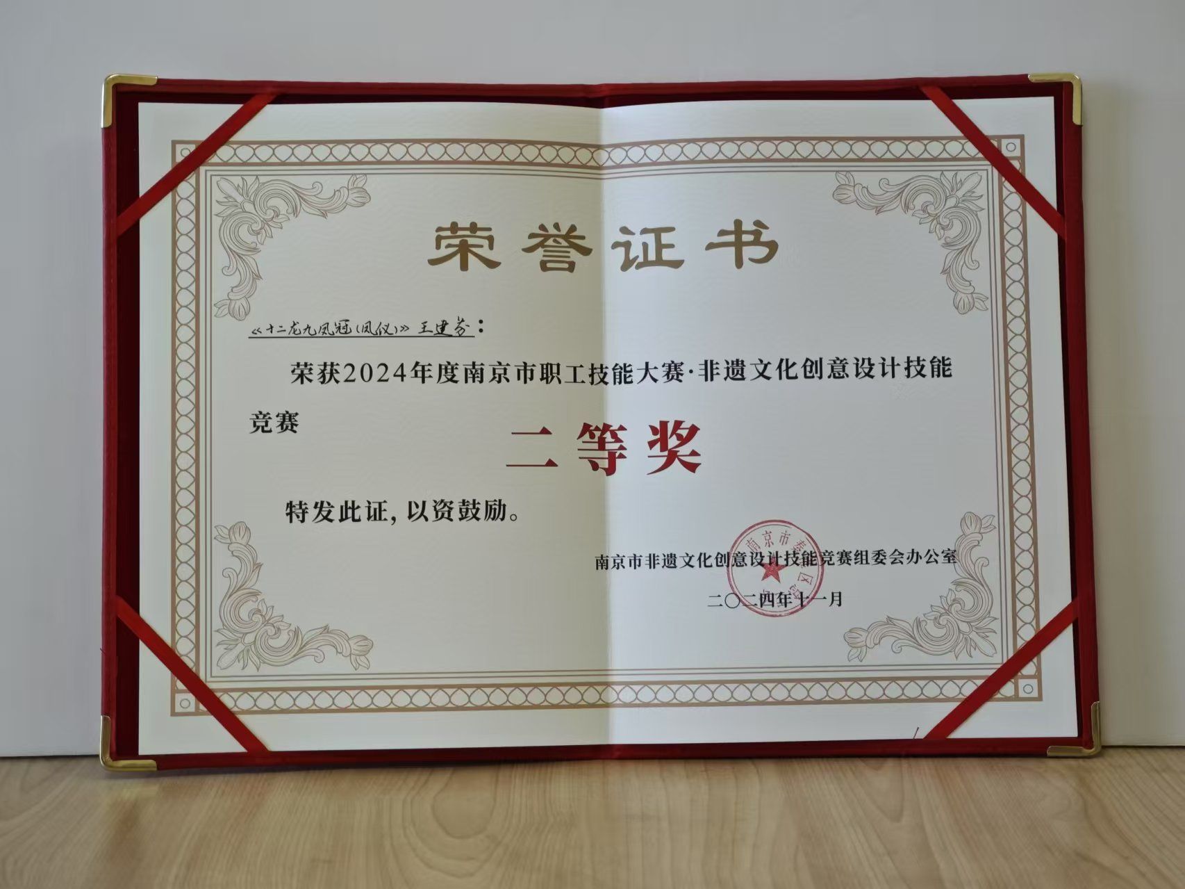2024年度南京市职工技能大赛非遗文化创意设计技能竞赛,决赛于2024年11月8号举行,来自必赢线路检测3003no1的 “三生令原创国风发冠”项目,通过初赛、复赛的激烈角逐,进入到决赛,品牌创始人马永强、王建芬携带原创产品非遗点翠复原款“十二龙九凤冠(凤仪)”参加决赛,荣获二等奖。