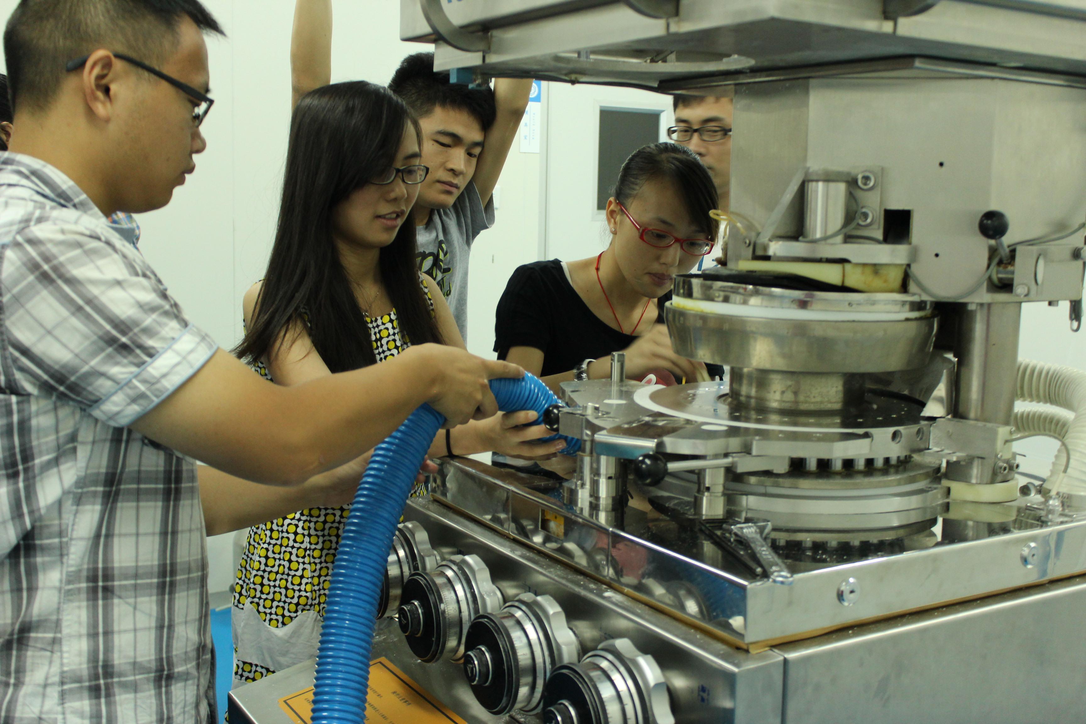 学生参与压片机的拆卸与清洁工作