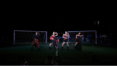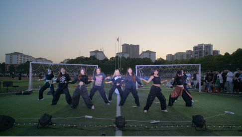 夕阳洒在绿茵场上,舞台灯光闪耀,炫彩的霓虹灯光、手环闪烁着荧光,将暮色点亮。胶囊音乐节以舞蹈《Exes》&《Taki taki》爆燃开场,她们整齐和谐的节律,铿锵优美的舞步,舒展灵活的动作,舞出了青春的活力,展出了时代的风采。在主持人的打趣下,气氛渐热。在大家的高声欢呼中,说唱组合闪亮登场,他们以一首自创《湖科cypher》吸引观众,带动了观众的激情。