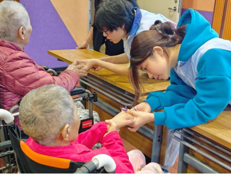 随后,志愿者与老人们共同投入到手工剪纸和剪指甲两项互动活动中。剪纸环节气氛温馨融洽,大家围坐一桌,彩纸在手中翻飞,老人们在志愿者的协助下完成一幅幅生动作品,脸上洋溢着喜悦与满足。在剪指甲的过程中,同学们格外轻柔细致,从稳定手势到小心修剪,再到耐心打磨边缘,每一个动作都饱含对老人的尊重与呵护。方寸之间的照料,传递的是家人般的温暖与安心。