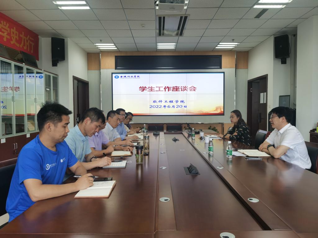 6月20日下午,党委学生工作部部长汪如春、副部长沐阳到软件学院调研指导学生工作,院党委书记徐志国、院长曾岳、党委副书记徐斌及全体辅导员参加会议。